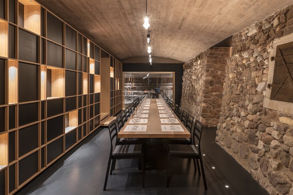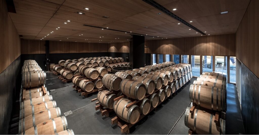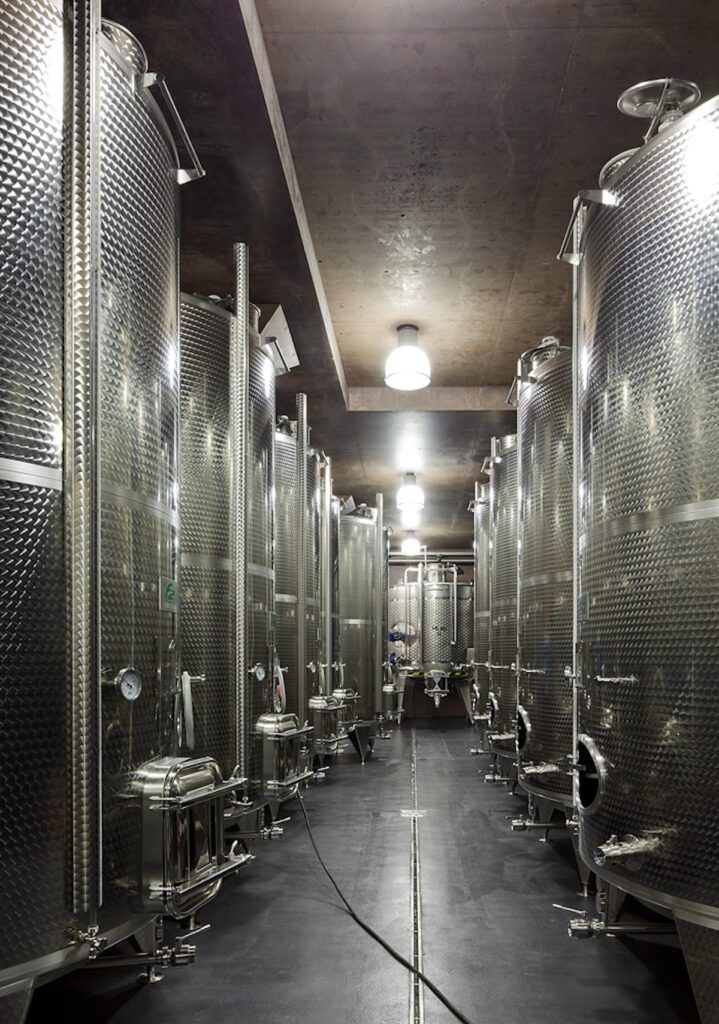 La trasparenza ha un ruolo centrale. Le ampie superfici vetrate non sono solo una scelta estetica: rendono visibile il lavoro che si svolge all’interno, trasformando la produzione in parte integrante dell’esperienza architettonica. La materia diventa racconto: vino, territorio ed edificio si riflettono a vicenda in un equilibrio calibrato di luce, densità e ritmo.