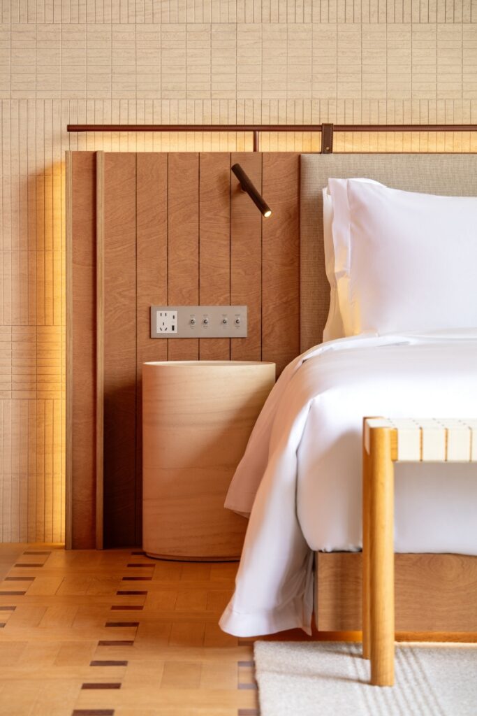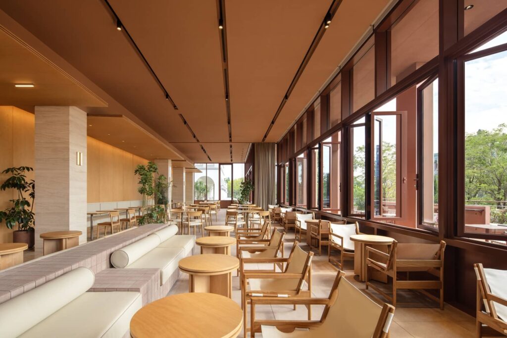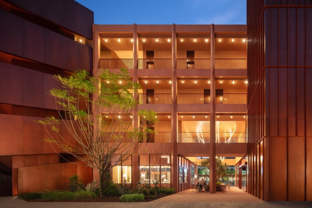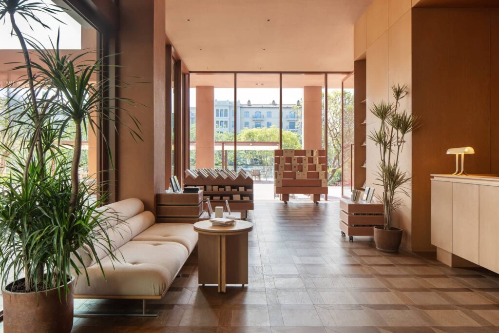 L’edificio è organizzato su quattro livelli: il piano terra è adibito a spazio comune accessibile al pubblico e ospita i negozi sopra menzionati, mentre gli altri piani sono riservati alle 18 camere dell’hotel, divise in tre tipologie. L’intera struttura è articolata su un colonnato continuo in calcestruzzo rosso che sfuma il confine tra interno ed esterno, creando un dialogo tra pieno e vuoto. Il colonnato al piano terra accoglie uno spazio fluido e pubblico che filtra la luce del sole, la brezza e i cambiamenti stagionali. Qui, i negozi arretrati creano una zona pedonale pubblica lungo la strada.
