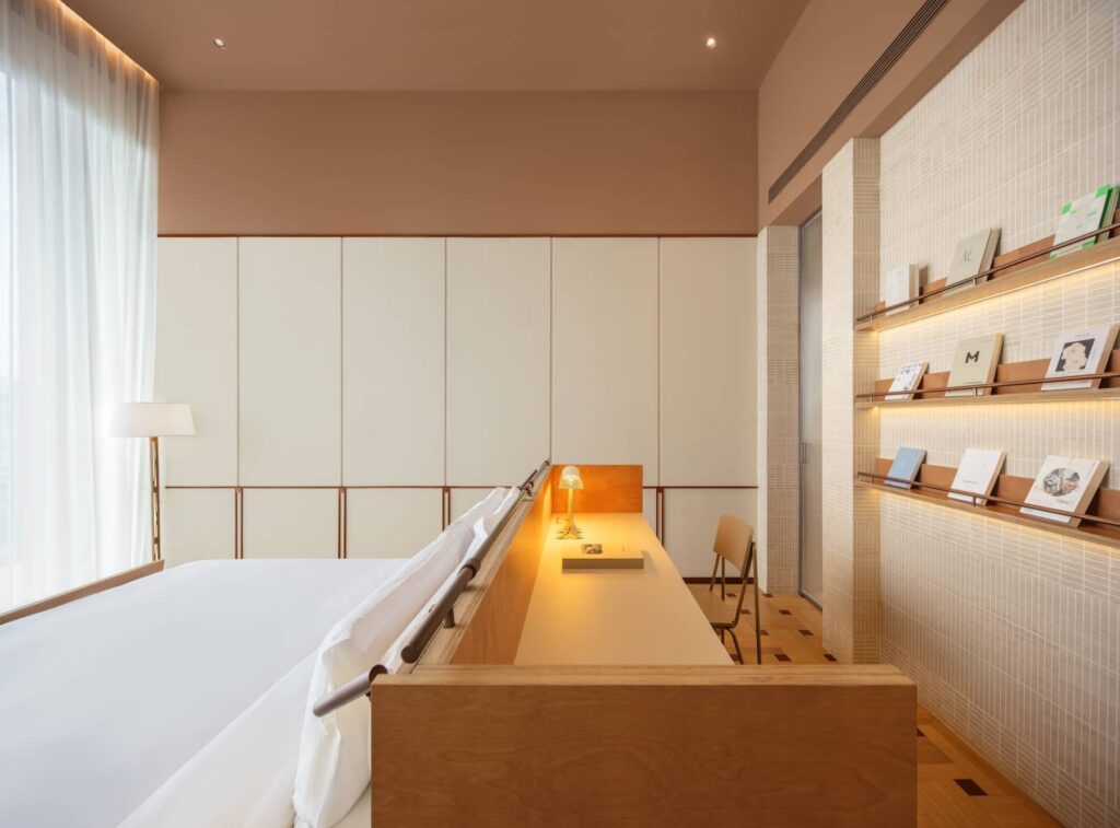 Le camere dagli alti soffitti sono impreziosite da essenziali elementi d’arredo in legno, alcune con zona lavabo a vista, scrivania ed espositore per i libri. La luce che entra dalle grandi vetrate dilata ancora di più gli spazi e amplifica le sfumature di texture e finiture interne.