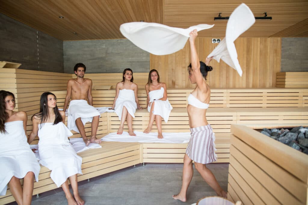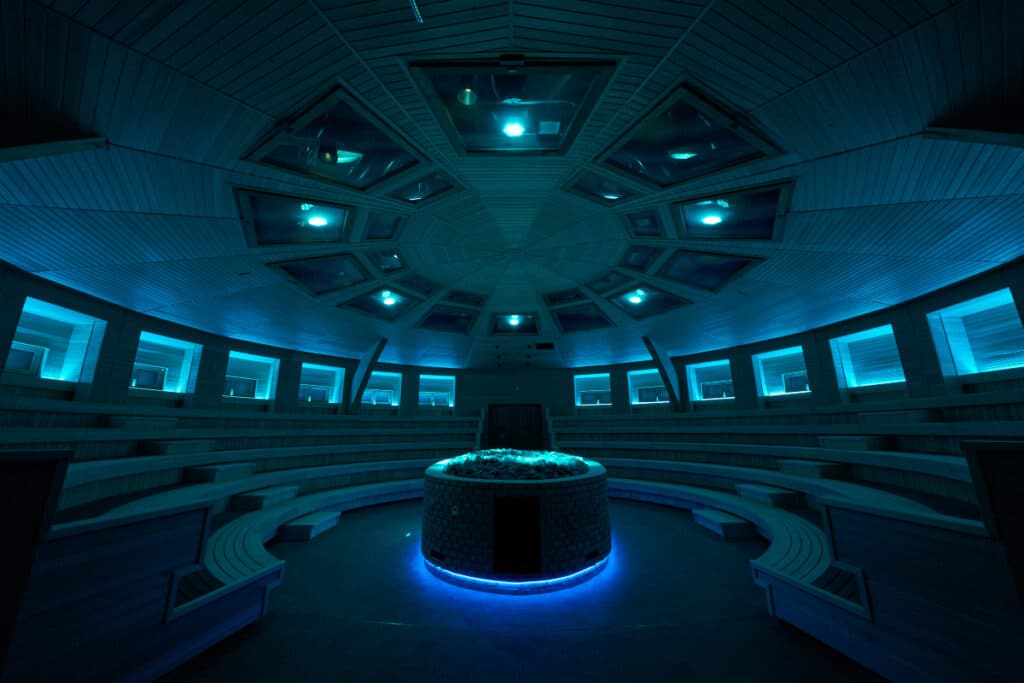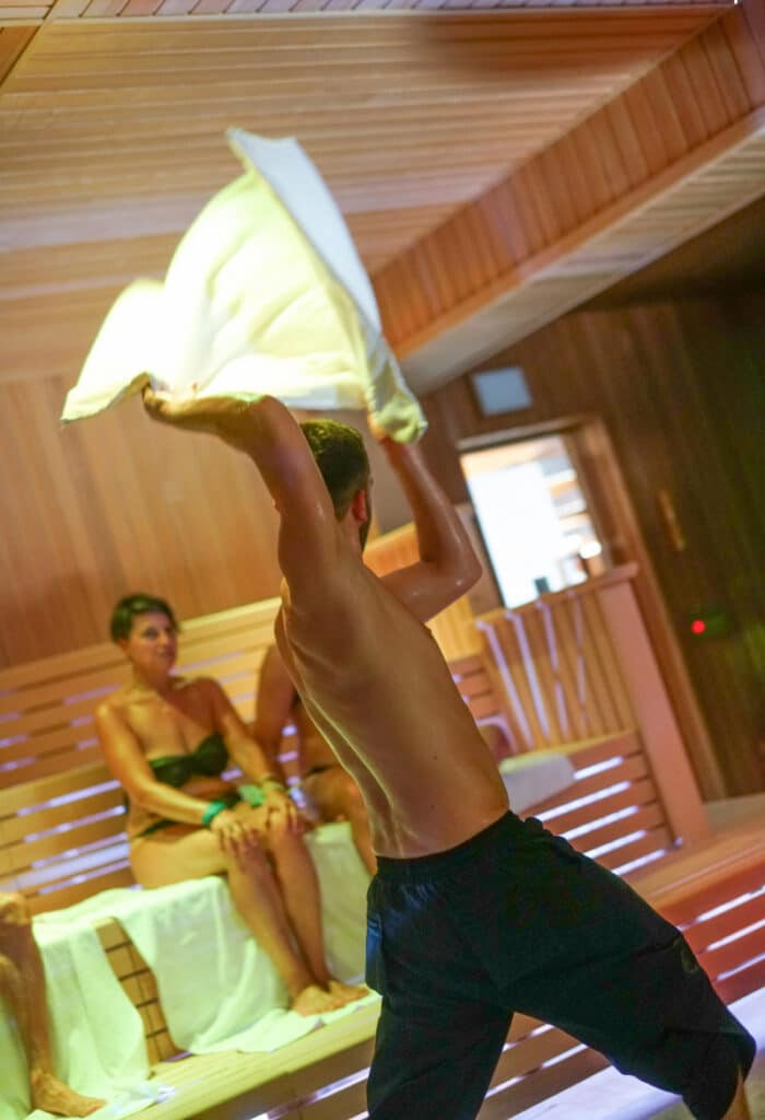 Prevede più fasi: lo spettacolo in sauna, lo shock termico con fontane di neve o ghiaccio, la reidratazione, infine il relax. Poi si può ripartire. È un ciclo che unisce benessere fisico ed emozionale, ed è a questo, secondo me, che si deve l’effetto ‘wow’. Si hanno a disposizione una serie di opportunità tutte nelle vicinanze: esco dall’acqua e mi godo un aperitivo nell’area food & beverage, oppure mi riposo, o magari prenoto uno spettacolo al Sauna Village. Posso partecipare ai rituali Aufguss, godermi gli show, gli spettacoli, oppure ricercare il relax e il silenzio. Questa multi-esperienzialità che offriamo è l’elemento più apprezzato.