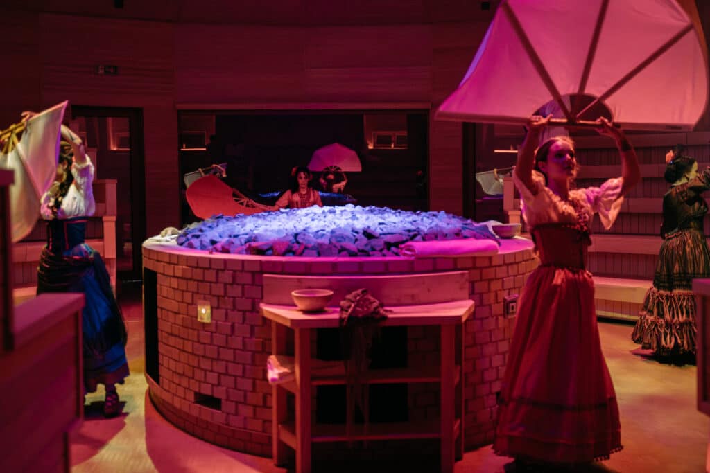 Perché lo è. Parliamo della sauna più grande al mondo. Si estende su 180 metri quadrati con i suoi 350 posti e integra un vero teatro: ledwall, luci, audio, campane di vetro, fontane danzanti. Qui si svolgono spettacoli complessi, in parte ispirati al Cirque du Soleil, con artisti, acrobati, musicisti e persino ‘pillole d’opera’ in collaborazione con l’Arena di Verona. Proponiamo l’opera in 15 minuti, rendendola accessibile anche a un pubblico giovane non abituato alla durata degli spettacoli canonici. È un progetto unico anche dal punto di vista tecnico: la vera sfida è mantenere temperature estreme e differenziate nello stesso spazio, fino a quasi 100 gradi nei livelli più bassi, e temperature moderate fino a 24 gradi nelle aree tecniche e sceniche, coordinando al tempo stesso luci, audio, vapore e sicurezza.