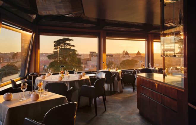 Dialoga con le linee pulite del volume il calore dei materiali utilizzati: le pareti sono interamente rivestite in legno di rovere, con cui sono realizzati anche i tavoli conviviali, mentre il pavimento è realizzato in cubetti di porfido, in continuità con la pavimentazione esterna.