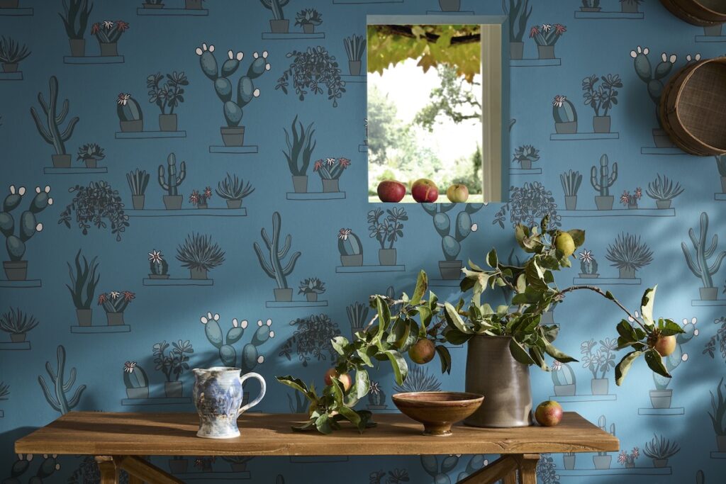 Portare la natura e in particolare le specie botaniche nell’orizzonte interno degli ambienti è uno dei principi che guida la creatività nel settore dei rivestimenti murali. Little Greene ne fornisce un’inedita interpretazione nella nuova collezione di carte da parati In the Garden, ispirata a grandi e piccoli giardini che sono custoditi e curati dal National Trust del Regno Unito. Mr Straw’s Greenhouse – Air Force Blue è una carta da parati dedicata a piante grasse e cactus fioriti e disposti su mensole, disponibile in sei varianti di colore.