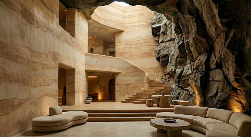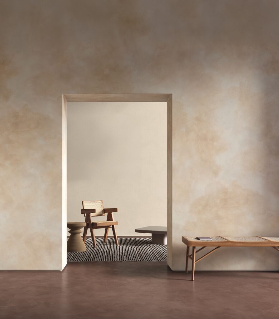 Sempre Novacolor propone una nuova finitura minerale che rende possibile creare superfici ispirate alla pietra e alla terra. I rivestimenti realizzati in CalceCruda appaiono stratificati e mutevoli in base alla luce, trasformando gli interni in una visione paesaggistica che sembra scolpita dal tempo.