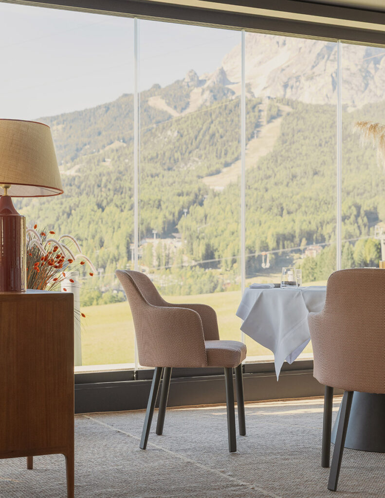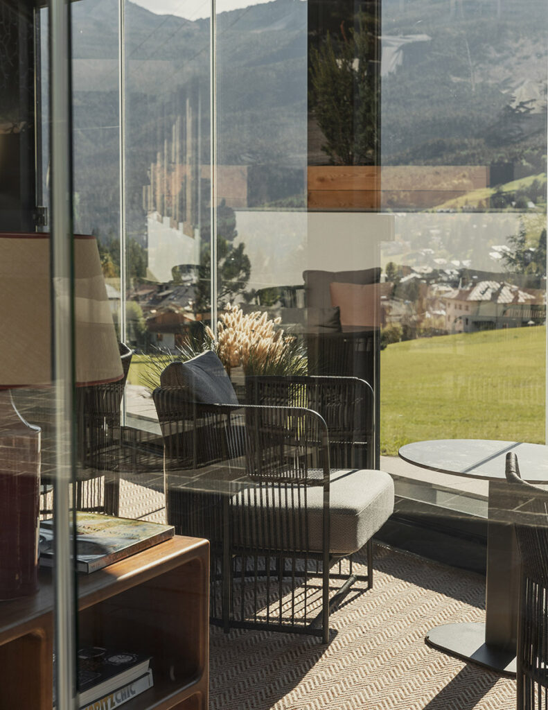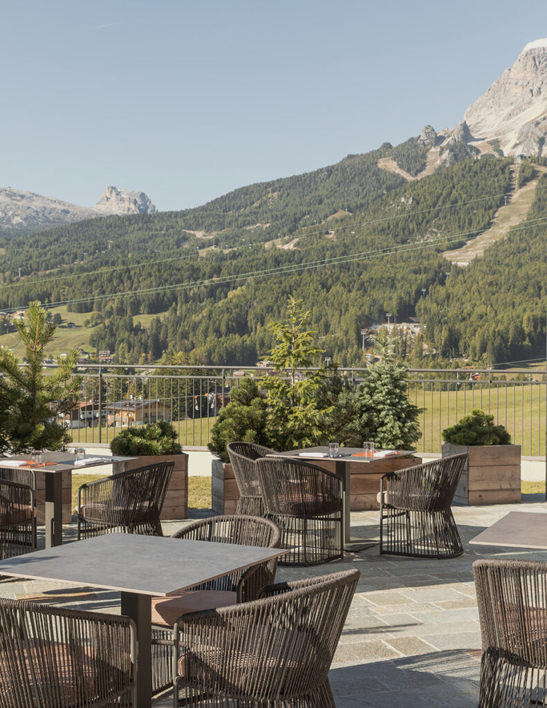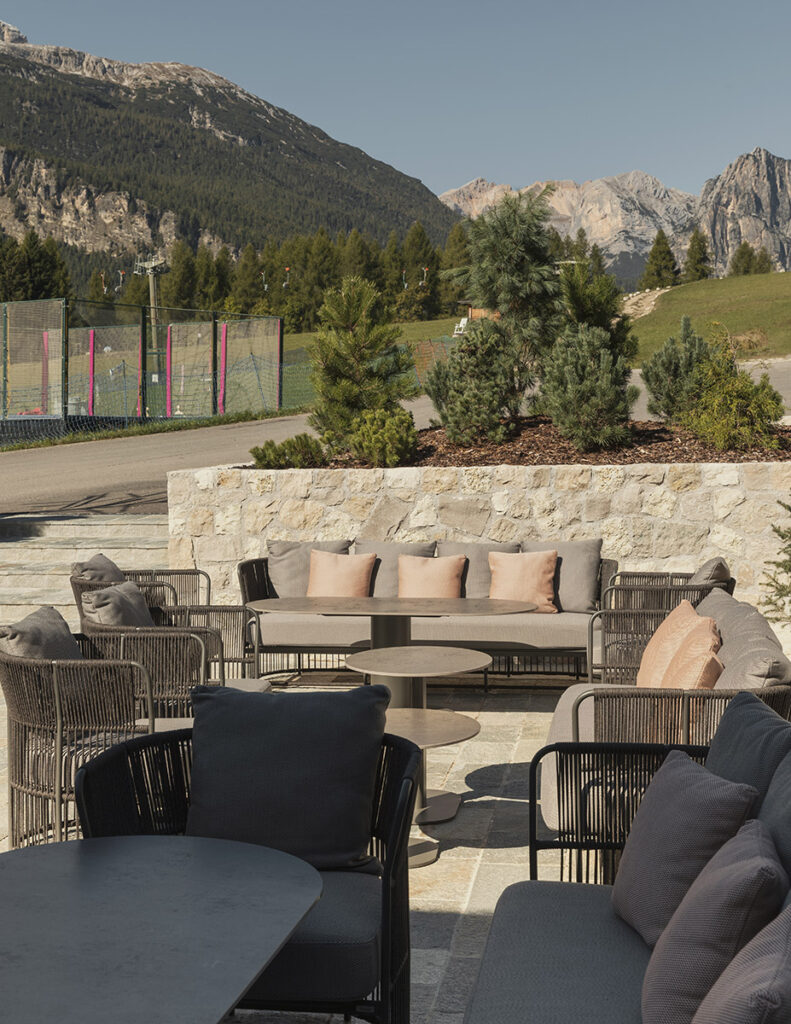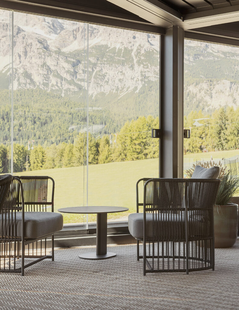 Sia all’ingresso della struttura che nella suggestiva veranda, poltrone, poltroncine e divani Tibibado offrono un comfort avvolgente che invita esplicitamente a fermarsi. Queste sedute sono strategicamente posizionate per permettere agli ospiti di rilassarsi e godere in piena tranquillità della vista panoramica sulla vallata di Cortina.