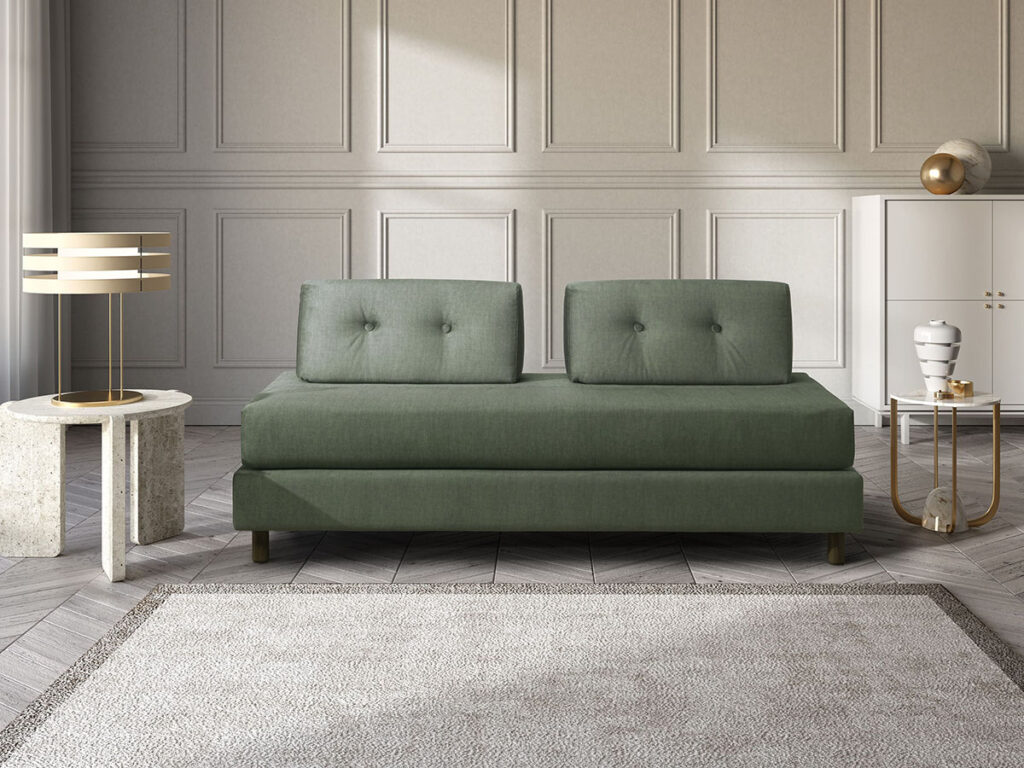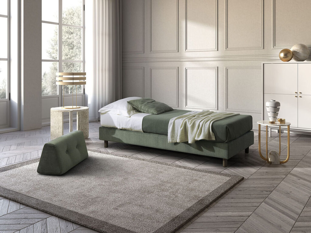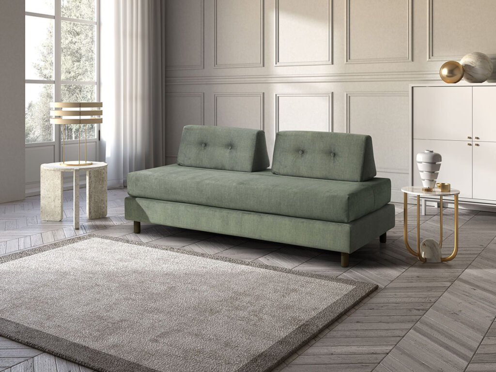 Entrano nel progetto d’interni due soluzioni funzionali per le camere da letto, ma con un taglio elegante e di design. Il modello Naim è un insospettabile divano letto; le sue generose dimensioni disegnano questo elemento come un divano in tutto e per tutto. Invece, si trasforma in un comodo letto ad alto grado di comfort con materasso Vieste alto cm14, omologato in classe 1lM.