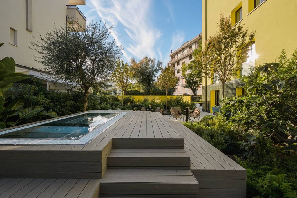 In questo modo terrazze e giardini possono diventare a tutti gli effetti uno spazio in più e il verde entrare a fare parte integrante del moodboard, come nel progetto per la Garden Suite di MODE, ECO MOOD HOTEL, il nuovissimo albergo a Rimini, zona San Giuliano, di proprietà di Mauro Santinato.