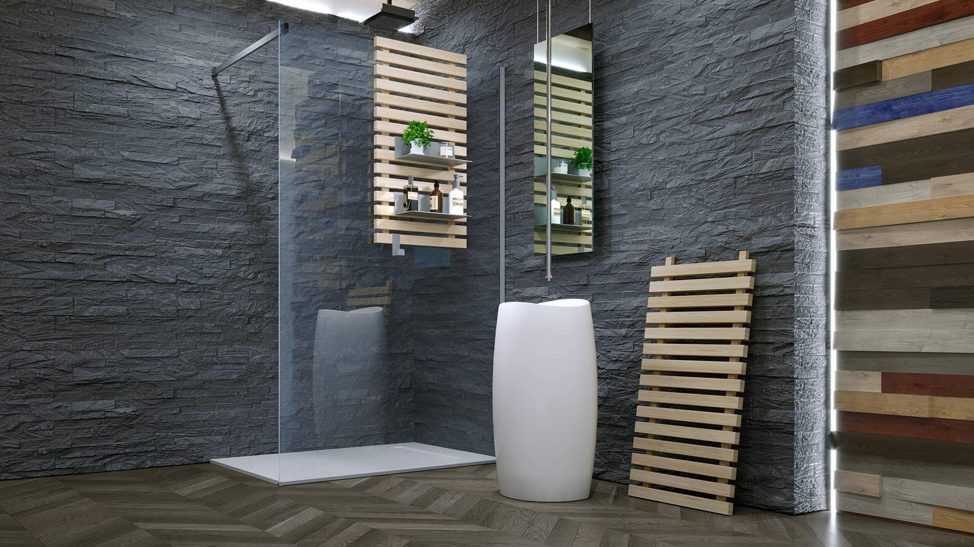 Eclipse di Megius è un elemento in listelli di legno okumè da installare direttamente sul vetro del box doccia per creare una quinta schermante. È attrezzabile con elementi in acciaio come la mensola porta oggetti, il gancio porta asciugamano e accappatoio e il porta spazzolino da denti.