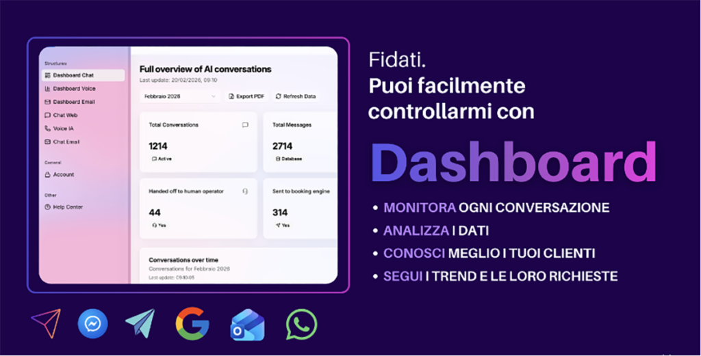Accanto alla gestione operativa delle conversazioni, la piattaforma offre anche una dashboard di controllo che consente alla struttura di monitorare le interazioni gestite, i passaggi verso il booking engine e i casi in cui la conversazione viene trasferita al personale umano.