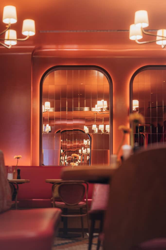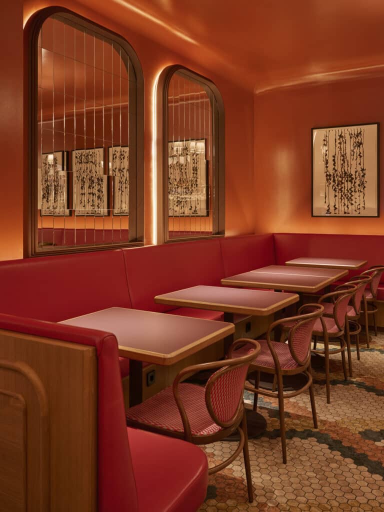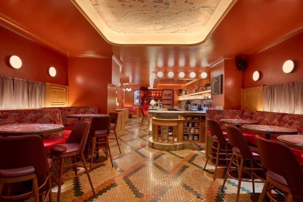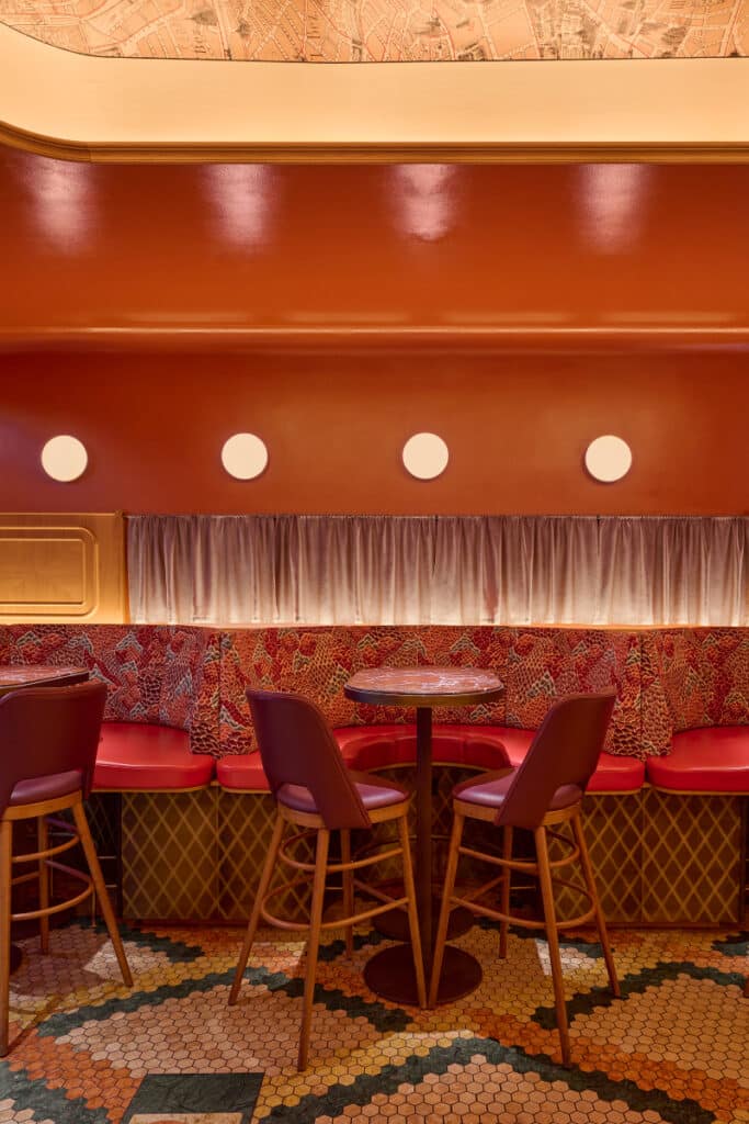 Sull’area d’ingresso, progettata per incontri veloci e informali con tavoli alti in pietra e panche imbottite, troneggia a soffitto la grande mappa tridimensionale della città di Vienna nei primi del Novecento. Il lungo bancone con alte sedute imbottite sul fondo del locale anticipa la zona consumazione strutturata con panche continue unite a sedie in legno curvato tipo Thonet e separé, che ripropone la conformazione trasformabile in ristorante tipica dei caffè viennesi. La sequenza di grandi specchi e i tendaggi rossi alle pareti sono un altro richiamo al classico, ma con lo scopo di ampliare e insonorizzare l’ambiente.