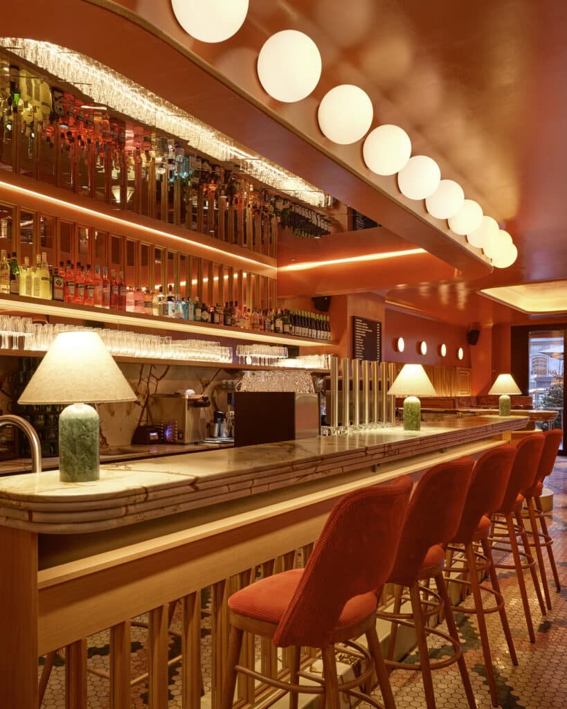 L’ingresso buio schiarito da una fila di luci sferiche si distingue per la sobrietà senza tempo che contrasta con la sovrabbondanza di pubblicità presente nell’ambiente esterno circostante. Erich Bernard, il visionario dietro lo studio di architettura BWM (sua la B nell’acronimo del nome, ndr), sottolinea quanto sia stato importante per impostare il progetto “esplorare quale potesse essere il futuro dei caffè e delle caffetterie, al di là della nostalgia e degli aspetti romantici, e anche che fosse un luogo per tutti”. In particolare, “per la gente del posto fra cui i cocchieri delle carrozze Fiaker che da 75 anni prendono il caffè in piedi”.