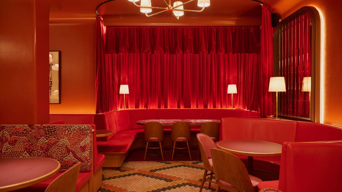 Sull’area d’ingresso, progettata per incontri veloci e informali con tavoli alti in pietra e panche imbottite, troneggia a soffitto la grande mappa tridimensionale della città di Vienna nei primi del Novecento. Il lungo bancone con alte sedute imbottite sul fondo del locale anticipa la zona consumazione strutturata con panche continue unite a sedie in legno curvato tipo Thonet e separé, che ripropone la conformazione trasformabile in ristorante tipica dei caffè viennesi. La sequenza di grandi specchi e i tendaggi rossi alle pareti sono un altro richiamo al classico, ma con lo scopo di ampliare e insonorizzare l’ambiente.