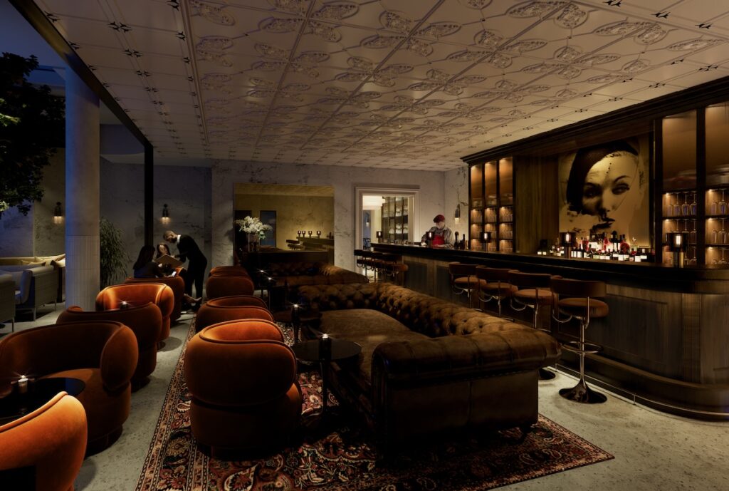 Le 105 camere giocano con il tema del viaggio e del tempo libero: carte da parati d’archivio, lampade e fotografie vintage richiamano il passato dell’Olympia Theatre, mentre le terrazze private aprono la vista sulla skyline. Opere di artisti locali – tra cui il pittore Kubi Vasak – contribuiscono a questa narrazione stratificata e vivace.