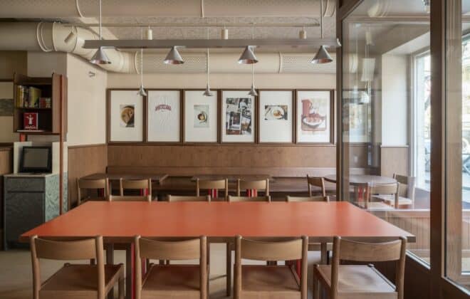 Lascia il segno El Equipo Creativo, lo studio di interior design con sede a Barcellona, che firma il ristorante Compartir Barcelona, nel distretto di Eixample, nel centro della città; in uno di quegli edifici storici di inizio del secolo scorso, con pilastri interni in ghisa, dove ti puoi immaginare ambientata una mostra di pittura contemporanea.