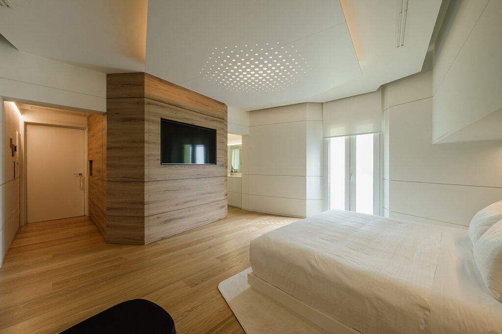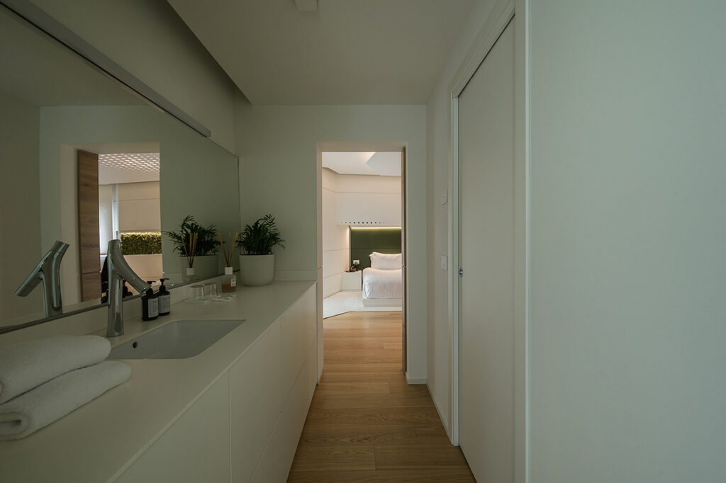Varcata la soglia di questa suite, il primo aspetto che mi colpisce è la perfetta integrazione tra le due anime della camera, una architettonica e una naturalistica, anche a livello cromatico. Entrando si viene investiti dal candore del bianco, così come dalle tante sfumature di verde adoperate. Da un lato la purezza del design che potremmo quasi definire scultoreo – tanto sono organici e lineari i confini degli spazi -, dall’altro l’invadenza della natura che, con le sue forme sinuose ed eleganti, prende spazio nella suite fino a integrarsi con gli arredi, creando un’architettura totale.