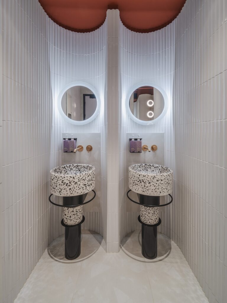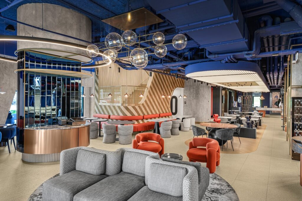 La lobby, il cui ingresso è condiviso con l’hotel Ibis Styles, è uno spazio ampio e dinamico con al centro il bar che cambia funzione nel corso della giornata come area colazione al mattino. Un ambiente polifunzionale concepito come un vero e proprio hub sociale con spazi per il coworking, zone relax, postazioni studio e gioco, bar self-service con punti di ristoro informali. Ogni area è progettata per favorire l’interazione e il lavoro condiviso con arredi diversi per forma e altezza, dotati di prese per la ricarica dei dispositivi.
