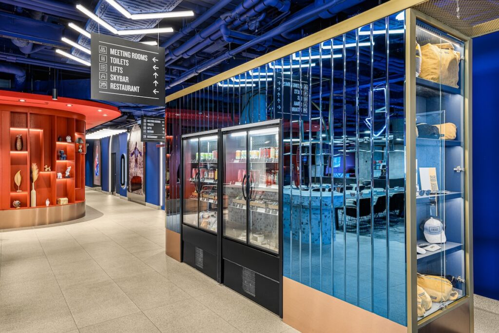 Camere e suite sono attrezzate di tutto punto per un soggiorno confortevole anche se di breve durata. All’ultimo piano, il rooftop bar, con vetrate panoramiche sull’aeroporto, superfici riflettenti e giochi di luce ripropone, amplificandole, le tonalità dominanti dell’hotel: blu, rosso acceso, il rosa e il color albicocca creano un effetto di fluttuazione e un’atmosfera cangiante come quelle del cielo visto dall’ aereo.