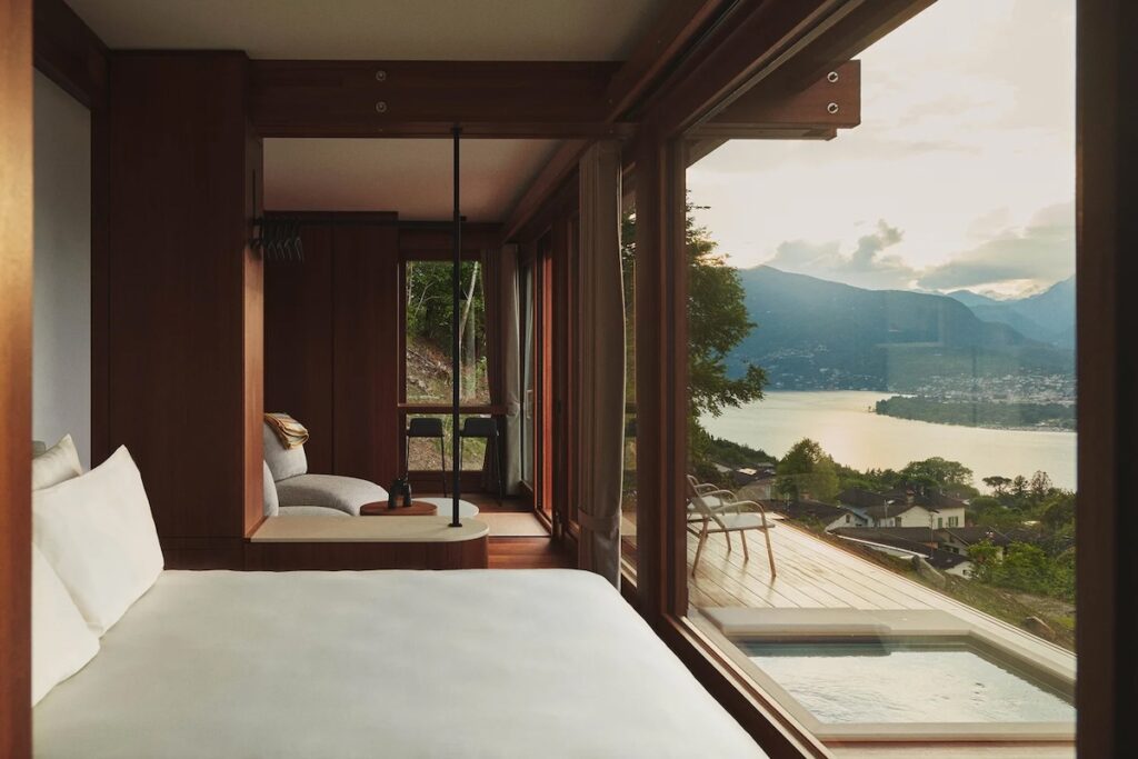 In apertura, una camera dell’hotel Habitat Lago Maggiore, a Piazzogna (Canton Ticino).