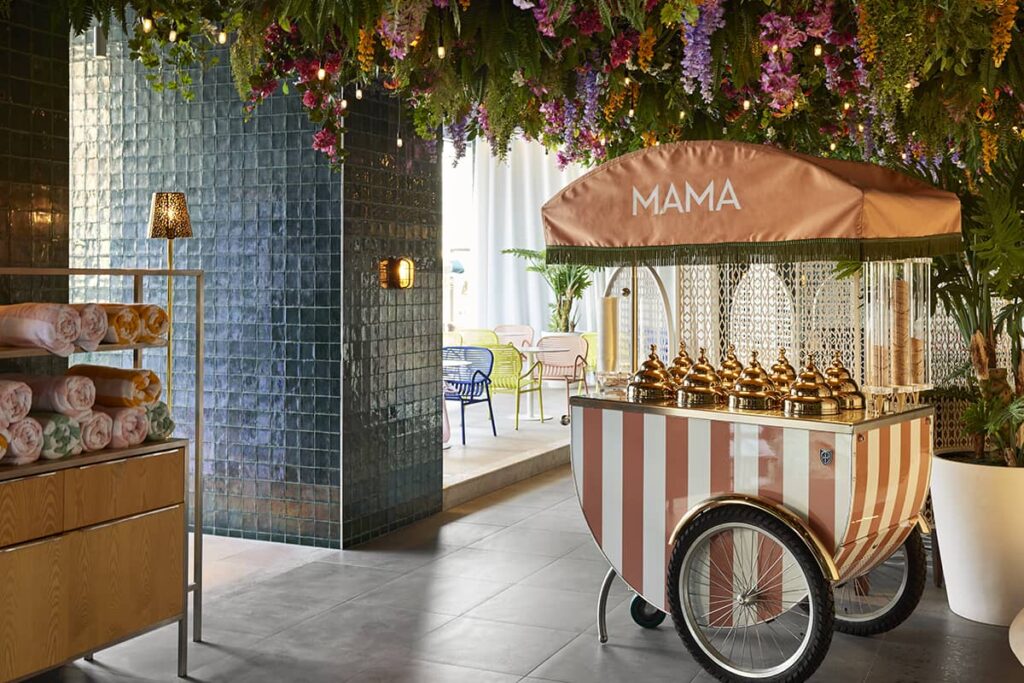 Insolito per gli standard di Dubai, la scelta di collocare le aree comuni nei primi piani dell’edificio: ristoranti, bar, piscine, lounge e persino un cinema all’aperto diventano spazi accessibili e aperti, in linea con la filosofia Mama.