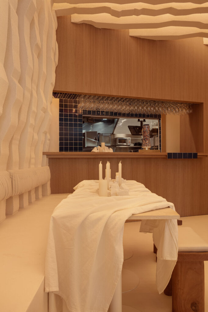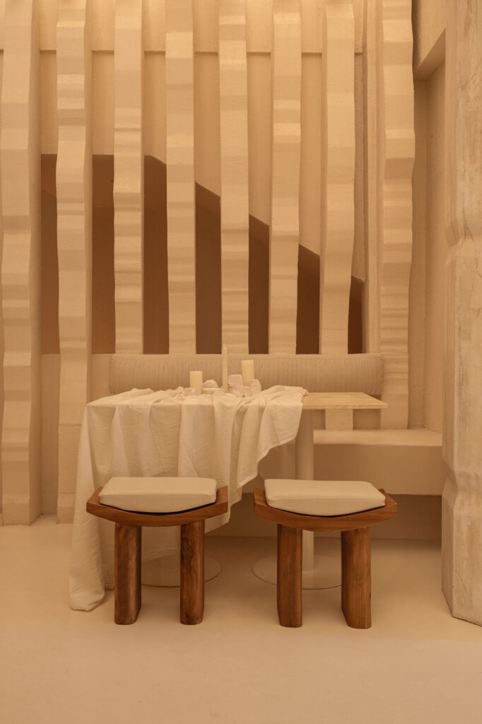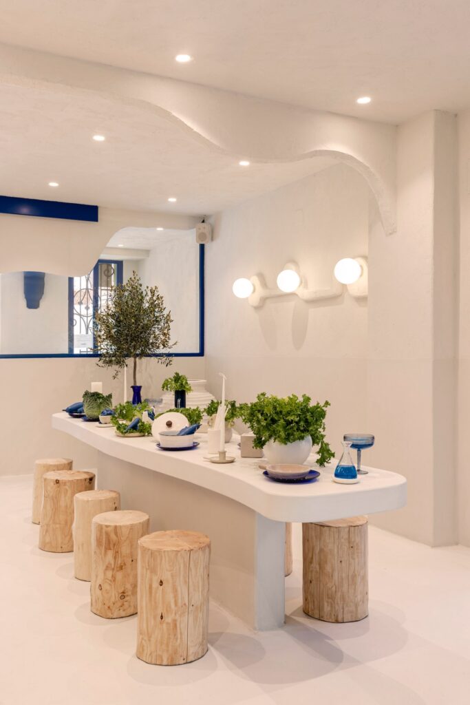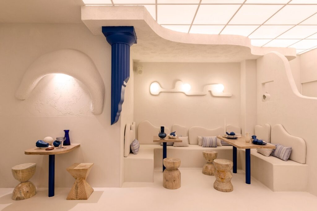 “Abbiamo cercato di materializzare la Grecia nello spazio – sottolinea Ana Milena Hernández – andando oltre il semplice utilizzo della consueta palette di colori bianco e blu”. Le pareti incorporano volumi dalle forme organiche che rappresentano la ricerca sull’essenza dell’architettura greca portata avanti dallo studio fondato da Ana Milena Hernández e Christophe Penasse.