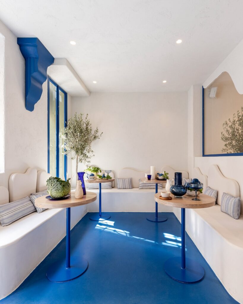 Altri calibrati tocchi di blu per i telai della vetrata d’ingresso, le stoviglie, il sostegno centrale dei tavolini e per il pavimento della saletta più riservata.