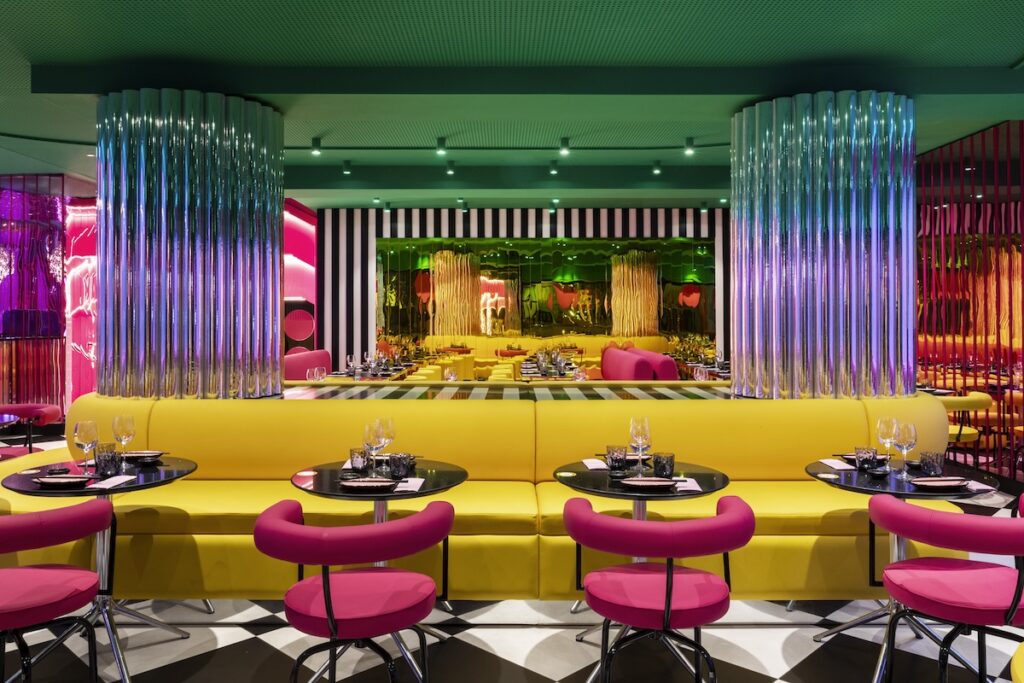L’effetto metafisico è implementato dai divani verdi metallizzati dalle forme pop e dai toni giocosi della seconda grande area consumazione, che si sviluppa attorno al sushi e al cocktail bar. Qui divani a onda gialli attorniano le grandi colonne con schienali tubolari e tavoli circolari a scacchi bianchi e neri. Il sushi bar, incorniciato da una linea fluida in metacrilato giallo e avvolto da lastre in gres smaltato colore magenta, costituisce il cuore produttivo e il fondale scenico del ristorante.