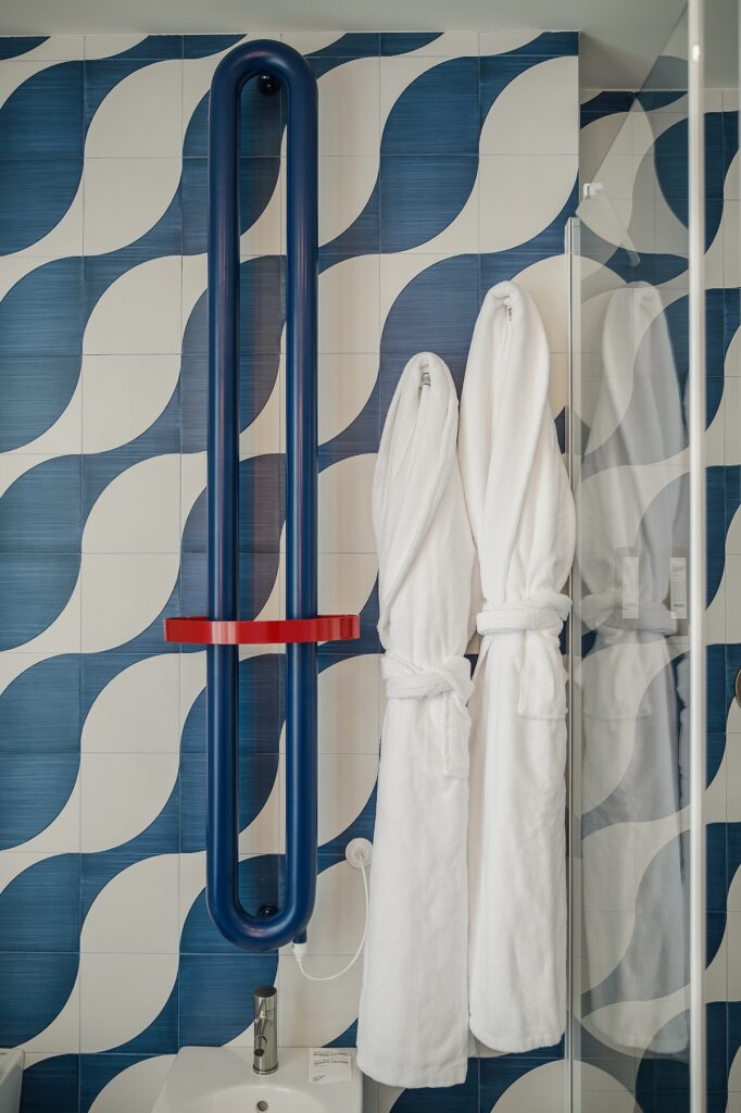 In Mare 3.0 non riscontro la vivacità e il ‘caos’ che le altre suite del Mode Hotel a tema mare mi trasmettono. Al contrario, la sensazione che ricevo è di calma e silenzio. Un po’ come se il mare, dopo esser stato a lungo scosso dalle attività umane, abbia abbandonato tutto ciò che non gli apparteneva per abbracciare, invece, la sua vera natura. Come la quiete dopo la tempesta, anche il mare del futuro si è liberato dei rifiuti e degli elementi esterni che non fanno parte della sua natura. Ha lasciato andare, proiettandosi in una dimensione di pulizia e di calma. La calma, appena entrata nella suite, è stata la primissima sensazione percepita. La calma data dalla regolarità delle forme, dalla pienezza dei colori e dai materiali naturali, riciclabili e biobased impiegati dallo studio GLA. Mare 3.0 è il manifesto tangibile di una nuova e necessaria economia circolare con un focus sull’elemento acqua, oggi come mai prima d’ora fragile e bisognoso di tutela.