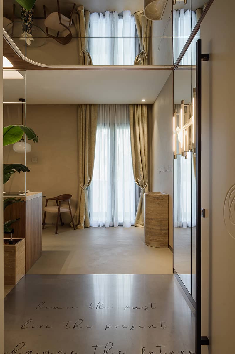 Chi entra nella suite Sensi all’hotel MODE, l’hotel ecosostenibile di Rimini, si disconnette dal mondo esterno e si riconnette a sé stesso. È un invito ad ascoltare i propri cinque sensi, a ritrovare il legame con la natura e a riscoprire l’essenzialità della materia. Ogni elemento, scelto con cura, è riciclato o riciclabile: nulla è lasciato al caso, tutto partecipa a un’armonia più grande. In ingresso, l’ospite viene accolto in uno spazio filtro: un luogo etereo di passaggio tra l’esterno e la connessione con sé, caratterizzato da superfici metalliche riflettenti, realizzati da Dreamet.