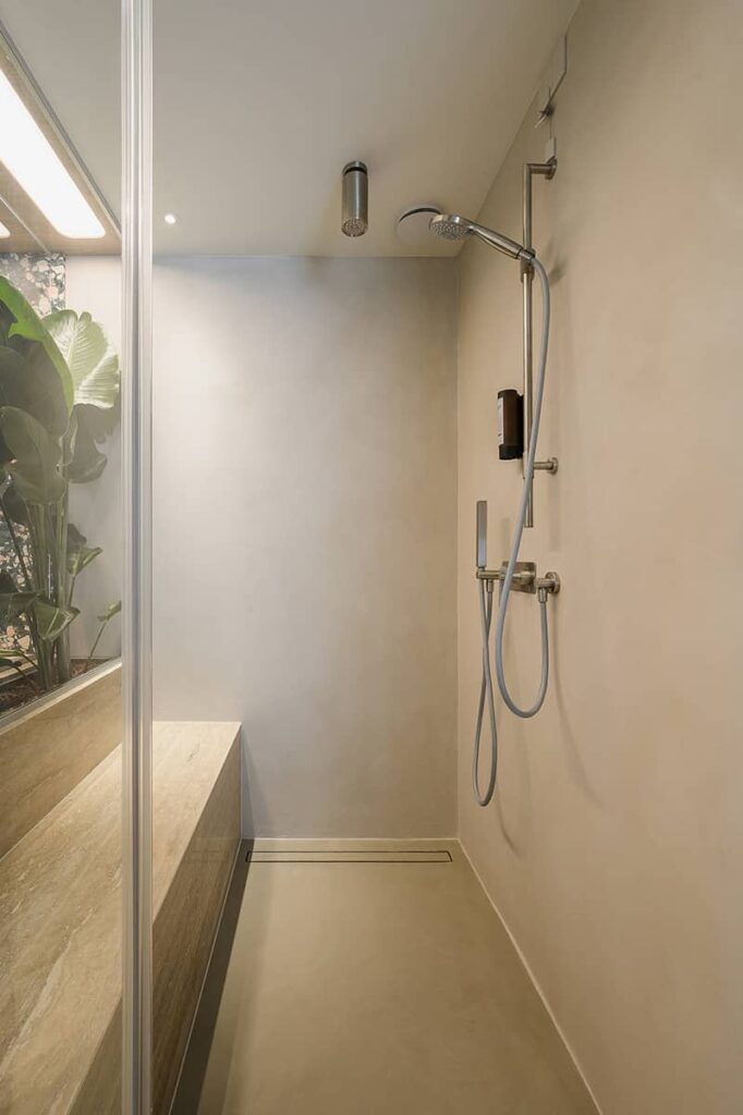 A terra si è invitati a camminare a piedi nudi, per percepire sotto le piante dei piedi la matericità della resina, fornita da HD Surface. L’azienda, leader nella produzione di superfici in cemento e resine per interni ed esterni, utilizza materiali completamente a base d’acqua, nel pieno rispetto dell’ambiente. Dalla stessa azienda proviene anche l’argilla che riveste le pareti, un materiale 100% naturale capace di assorbire l’umidità in eccesso e rilasciarla quando l’aria è troppo secca, contribuendo al benessere ambientale e prevenendo muffe e condensa.