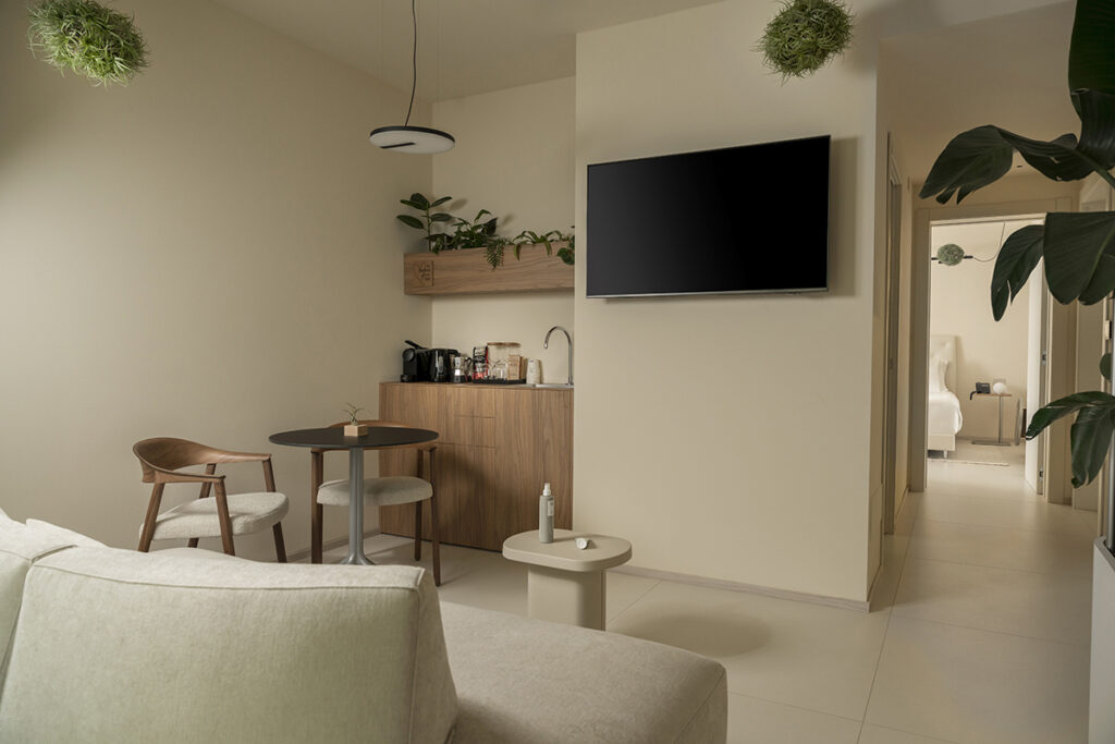 Al piano terra, la Garden Suite progettata da ROBERTA STUDIO accoglie gli ospiti in una soluzione pensata per far vivere all’ospite un’esperienza di benessere, con un’attenzione particolare al pianeta, anche grazie alla collaborazione con aziende B Corp e con una visione che pone la sostenibilità al centro. Progettata secondo i principi del biophilic design, la suite riprende forme organiche della natura, colori ispirati a una città di mare, e materiali ecosostenibili e naturali, aggiungendo un tocco di verde vivo e straordinario in ogni stanza.