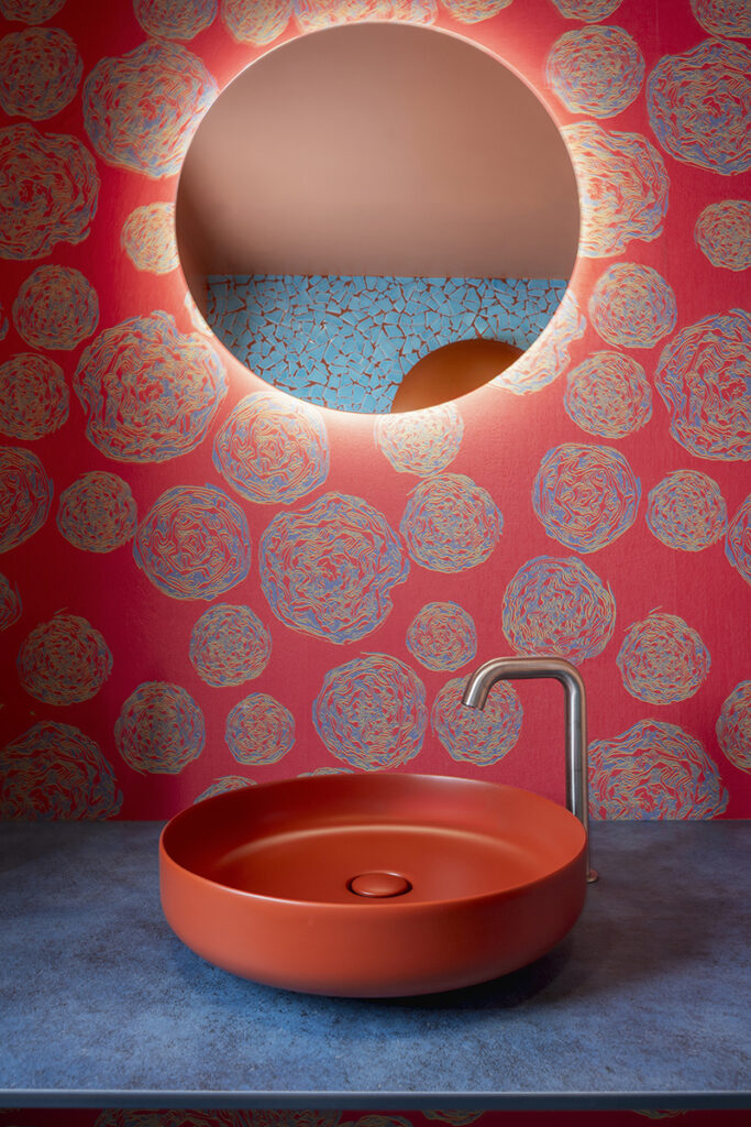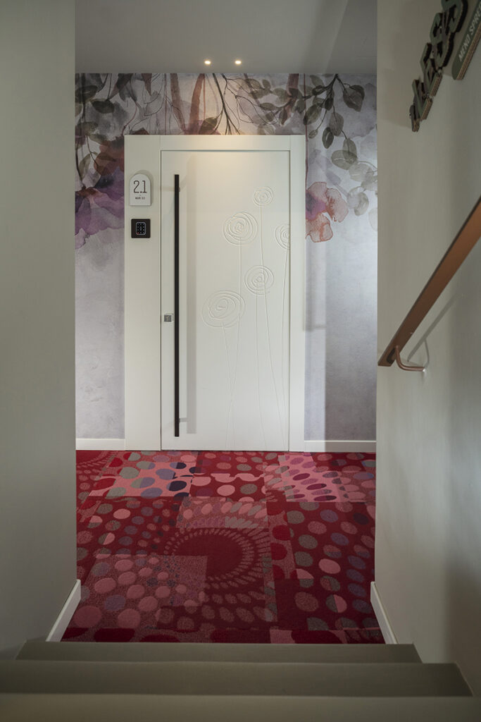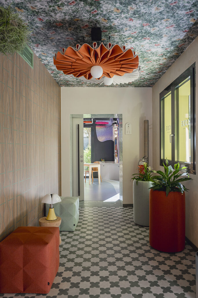 L’ingresso, le scale e la restroom al piano terra sono studiati da Laura Verdi. Il titolo del progetto “Stai cosy in una second life”. “È un gioco di parole tra italiano e inglese che significa: trovati a proprio agio in una seconda vita, recupera e riutilizza il più possibile, non sprecare le risorse attuali”. Un progetto di sostenibilità che si traduce non solo nel riciclo e riutilizzo di materiali (come per esempio la plastica proveniente dalla pulizia degli Oceani utilizzata per la realizzazione delle moquette o i corpi lampade fonoassorbenti fatte in feltro realizzato con bottiglie di plastica PET) ma anche una sostenibilità estesa al benessere della persona, amplificando il concetto di rapporto tra uomo-natura con l’utilizzo di disegni biogeometrici e floreali e inserendo elementi di verde come le piante di tillandsia, che si nutrono dell’umidità presente nell’aria e la purificano eliminando gli agenti inquinanti.