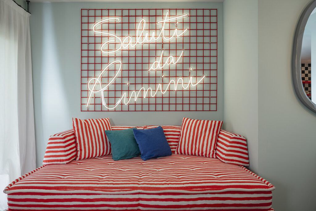 La suite Estate Italiana racconta quel modo spensierato di vivere la vacanza estiva in riviera, un omaggio up to date all’unicità dell’accoglienza riminese, con un chiaro riferimento alle cartoline che venivano spedite dalle vacanze, ripresa nella testata del letto. “In questo progetto vogliamo mettere al centro l’essere umano, parlando di sostenibilità sociale. Il rispetto della produzione, del lavoro artigiano e del tempo che l’artigiano dedica, quindi la qualità della vita di chi produce gli oggetti che usiamo”.