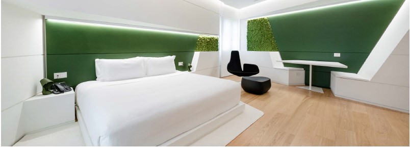Greenside è il “lato verde” ma anche il “verde dentro”, una visione rivoluzionaria di suite sostenibile. La parola chiave è ibridazione degli spazi che diventano fluidi, dai confini sfumati. Il design è iper-minimalista e parametrico: imita la natura attraverso algoritmi di progettazione che disegnano spazi organici, quasi scultorei. La suite smette di essere soltanto un contenitore che ospita, diventando un’architettura totale in cui lo spazio fisico si fonde con gli arredi, l’illuminazione e l’esperienza-utente. Linee continue, modellate plasticamente, che si ispirano alla natura, uno scrigno avveniristico ma caldo, un luogo esperienziale in cui materiali vivi, naturali e riciclati sono reinterpretati e riproposti in uno stile minimal green che si ispira alla progettazione bio-mimetica più evoluta.