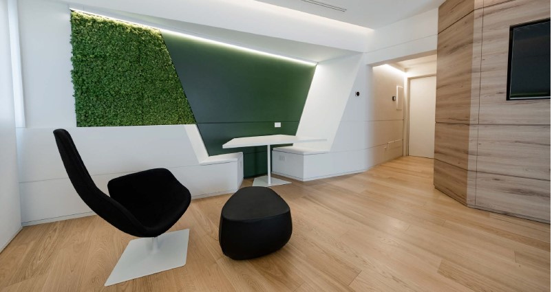 Il risvolto estetico è un ambiente che riprende i colori del mare e forme sinuose sia nelle grafiche a pavimento che richiamano appunto le onde che nella grande parete curva all’ingresso che racchiude la zona servizi. La sfida è anche quella di raggiungere un basso impatto sull’ambiente, dimostrando come sia possibile immaginare e realizzare nuove architetture mantenendo un impatto sempre più vicino allo “zero carbon footprint”.