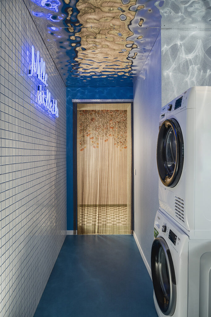 Progetto nel progetto è Mille bolle blu, la lavanderia a disposizione degli ospiti, dove una scritta al neon illumina in un gioco di riflessi un soffitto in alluminio (facilmente smaltibile e riciclabile) che riproduce l’effetto acqua.