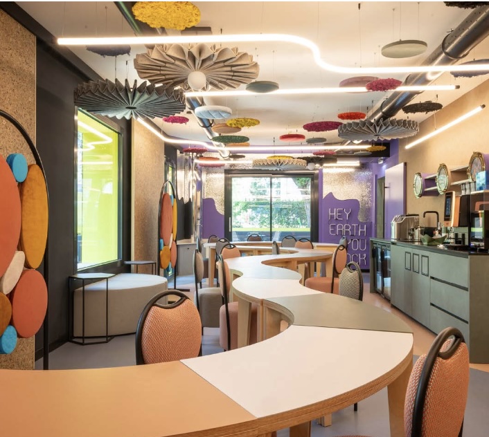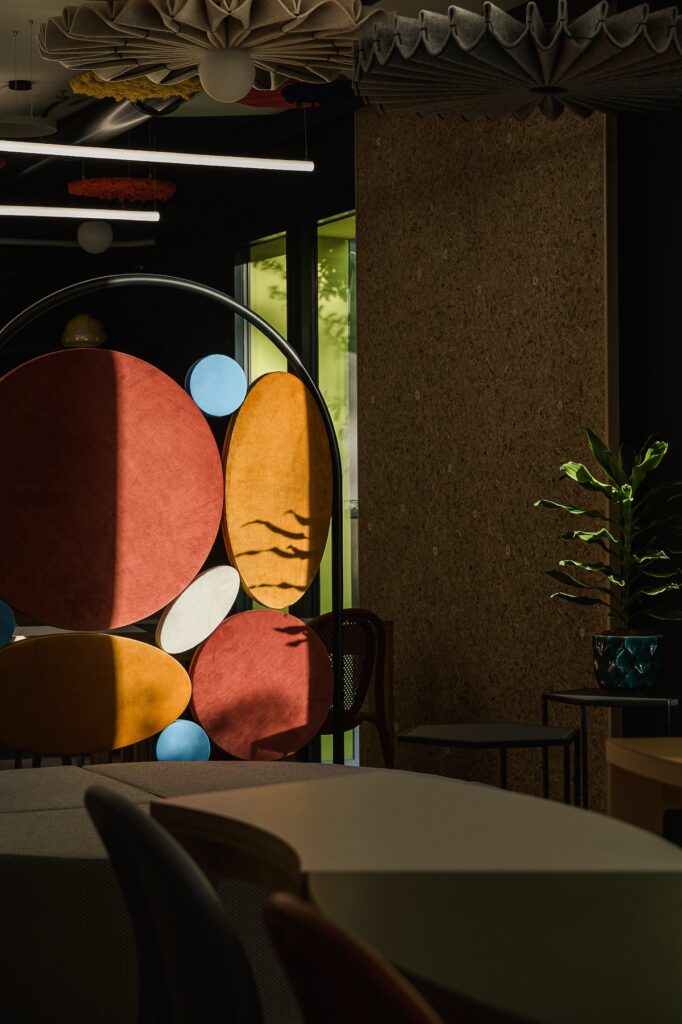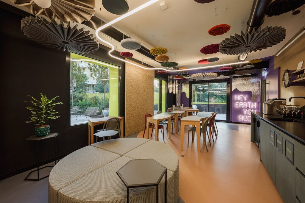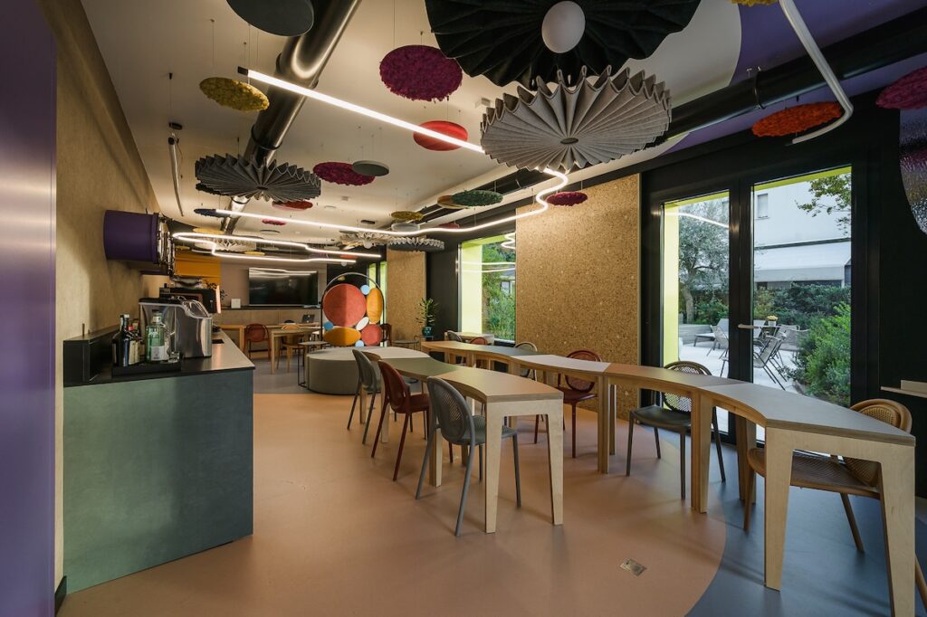 C’è un grande tavolo modulare, colorato, fatto a curve, che si può comporre e scomporre come si vuole. Anche le sedute sono insolite, piccole poltrone di design dai colori diversi, accoglienti, originali. E poi ci sono gli elementi fonoassorbenti appesi al soffitto, che sembrano quasi opere d’arte: invece servono e funzionano. Il risultato è un ambiente silenzioso, ma non spento.