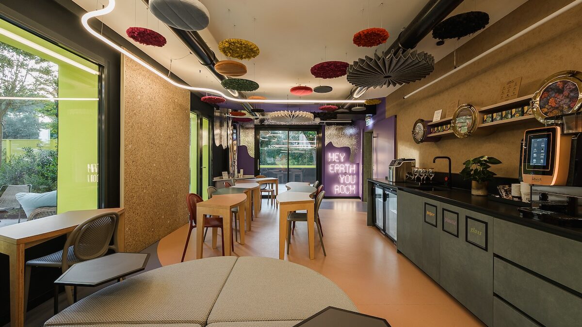C’è un grande tavolo modulare, colorato, fatto a curve, che si può comporre e scomporre come si vuole. Anche le sedute sono insolite, piccole poltrone di design dai colori diversi, accoglienti, originali. E poi ci sono gli elementi fonoassorbenti appesi al soffitto, che sembrano quasi opere d’arte: invece servono e funzionano. Il risultato è un ambiente silenzioso, ma non spento.