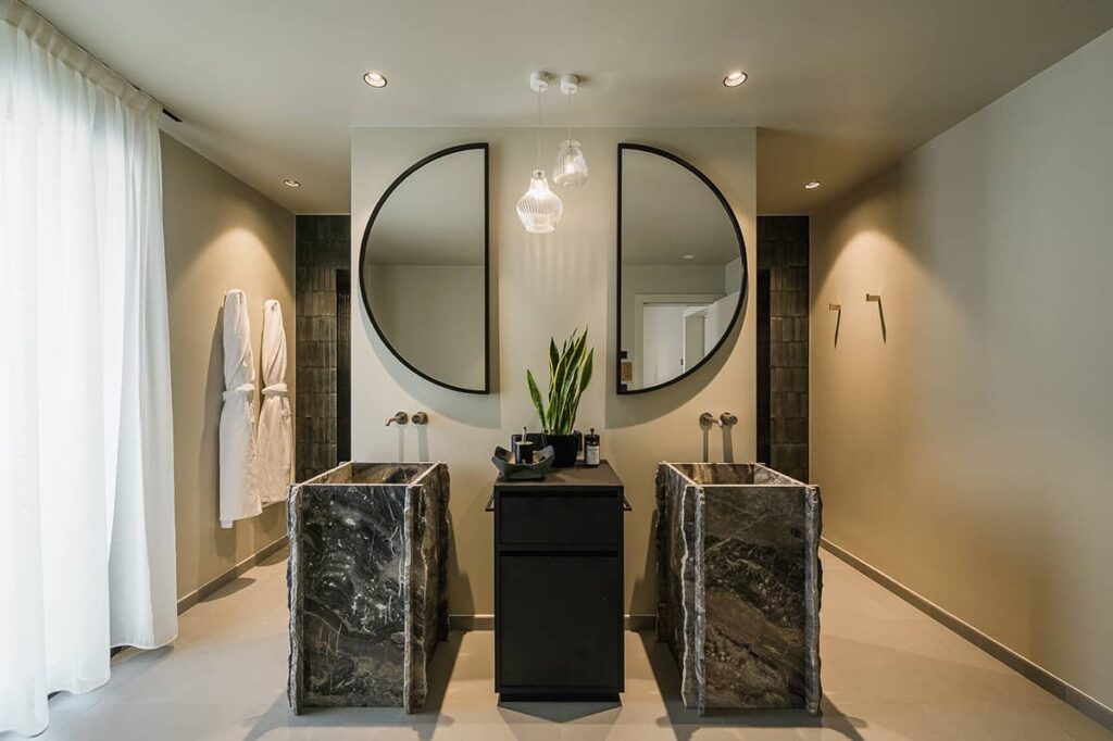 Iconici i lavabi in marmo scavato, due pezzi scultorei realizzati su disegno con lastre di recupero da Borga Marmi, studiati pensando alla loro durabilità nel tempo. Essenziale il temoarredo di Antrax, Tubone, scelto nella colorazione nera in contrasto con i muri e i pavimenti chiari, rivestiti in lastre di ampio formato in gres porcellanato di Ceramica Sant’Agostino, come anche i listelli ceramici Tetris utilizzati per rivestire la zona doccia realizata a pavimento canalina in acciaio di Kaldewei. La rubinetteria in acciaio spazzolato è di Gessi e a risparmio idrico.