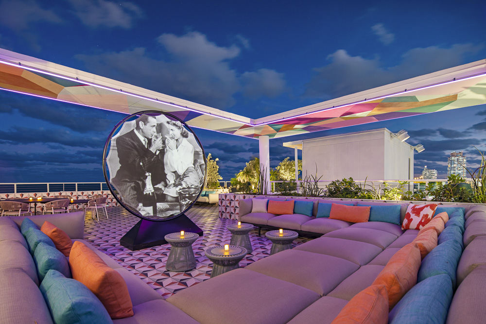 La rooftop lounge è caratterizzata da una piscina circolare attrezzata con sdraio e lettini e un maxi schermo tondo per guardare film all’aperto e offre una vista a 360° sul panorama di Miami.