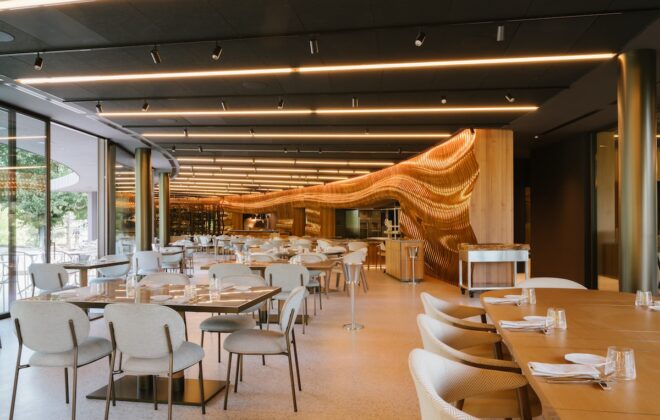 Separé in blocchi di argilla fatti a mano creano ombre e superfici strutturate, mentre sedie in rattan e tavolini riportano all’artigianato locale della Costa Brava, come anche i tessuti filati a mano. La Placeta, la piazzetta che segna l’ingresso al Palau, interpreta gli spazi di socializzazione di un tempo, attualizzandoli con un design moderno e diventa una destinazione dove incontrarsi per un aperitivo, al Gipsy Bar, per poi cenare al ristorante Casa Heras, dipinto con i murales di Joana Santamans, illustratrice di ispirazione naturalista barcellonese.