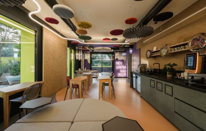 L’area co-working si sviluppa lateralmente alla zona ristorante. È un’area multifunzionale, sviluppata con banconi industrial in legno e struttura metallica e sgabelli vintage. Tutt’intorno una boiserie canettata fa da elemento di unione tra questo e gli altri ambienti del Post, trasformandosi in pannelli in legno dallo stile più contemporaneo. La zona biblioteca è caratterizzata da librerie bianche alle pareti, con vani ad arco, arredata con oggetti decorativi colorati e libri di diverso argomento.