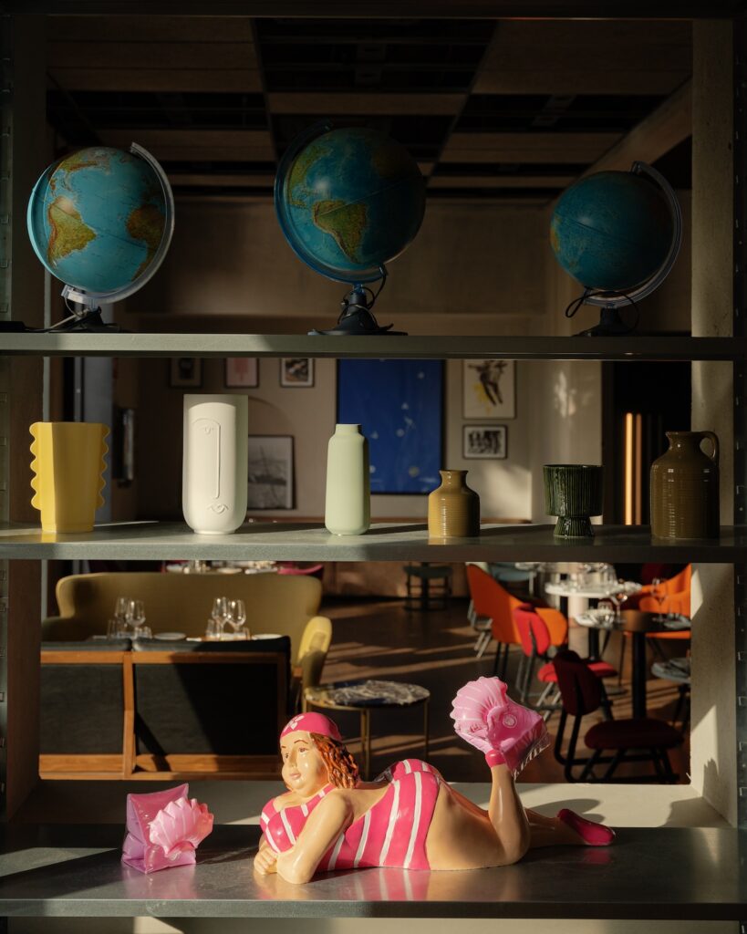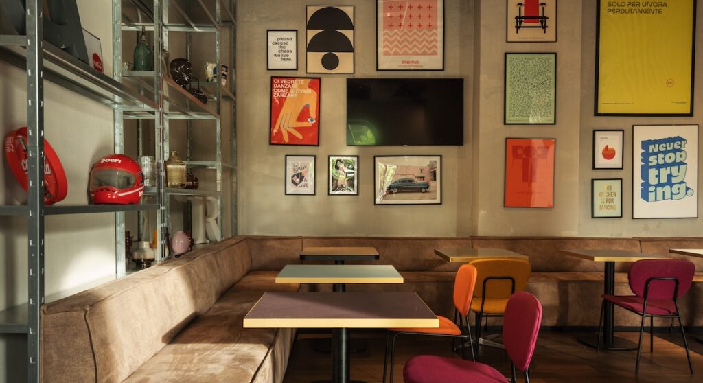 Dalla zona ibrida a sinistra della reception, con scaffalature rosse di Situer Milano e arredi UHS, si accede al ristorante che si snoda in vari ambienti con pareti in cemento, boiserie in piastrelle di ceramica e stampe grafiche di q-bic e Nag Atelier che richiamano il mondo della pubblicità, del design e della Versilia anni Sessanta. Gli impianti a soffitto a vista sono accoppiati a corpi illuminanti di fattura nautica di Toscot per creare un gioco di riflessi con la bottigliera del bancone bar della sala principale realizzata su disegno da Soluzioni Arredamenti.