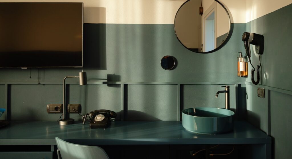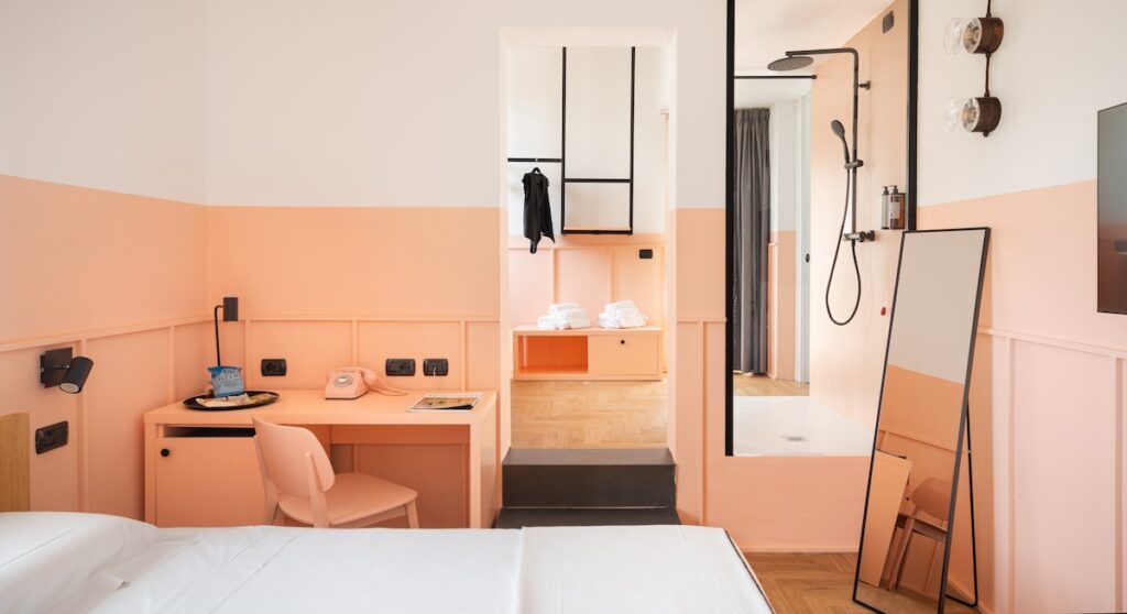 Rivestimenti invertiti invece per la tipologia Tiles: ceramica nelle tonalità Cotton, Ginger, Peach, Teal di Marazzi per le camere e resina monocolore per i bagni, entrambi illuminati da sistemi Genuit a vista. Nelle camere Materica, in linea con le zone comuni, convivono cemento e legno utilizzato per la boiserie quasi a soffitto che modella anche il baldacchino del letto. Il tutto illuminato da reglette a vista lungo le pareti.