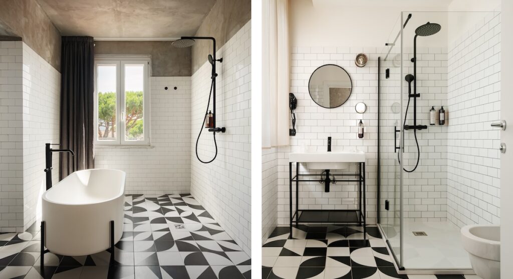 Le 73 camere ai piani superiori dei tre blocchi del complesso sono impostate su un layout originale dalle linee essenziali costruito su tre mood in diverse varianti di colore: Monochrome, Tiles, Materica. Le stanze Monochrome, con fascia perimetrale continua a mezza altezza che contamina del suo colore tutti gli elementi sottostanti, si differenziano per il lavabo interno alla scrivania, la doccia a vista o per il pavimento dei servizi con piastrelle black&white Marazzi.