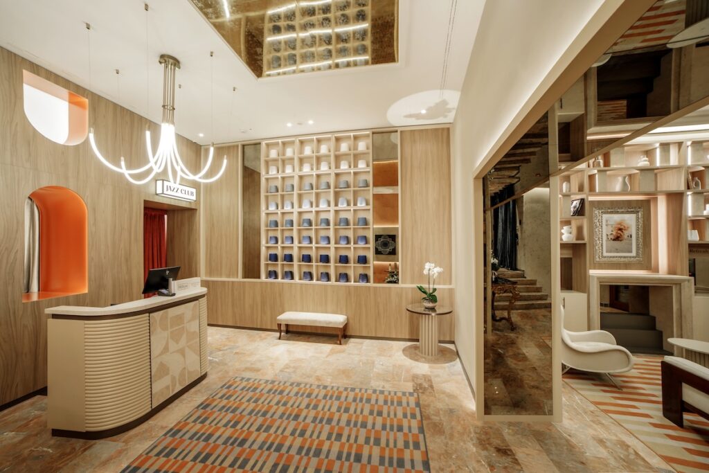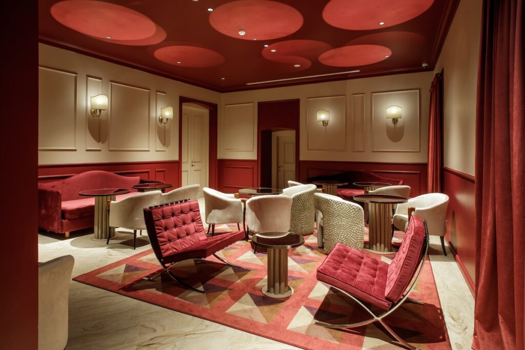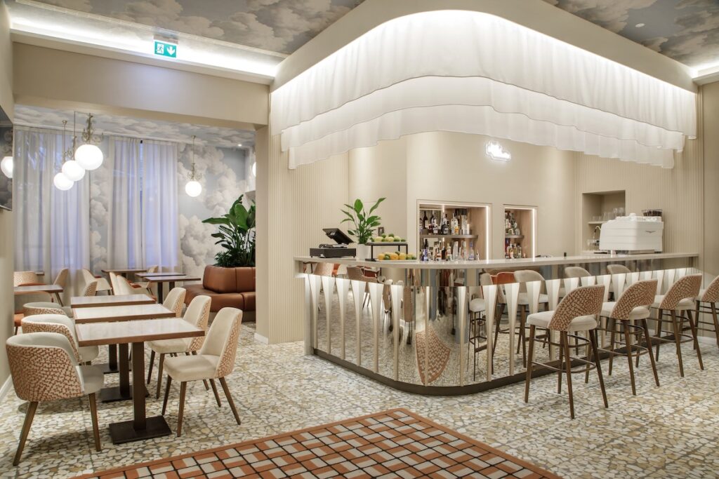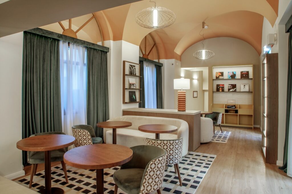 L’hotel è pensato come un luogo aperto alla città. Le aree comuni ospitano attività legate a tre eccellenze del territorio – cioccolato, cashmere e ceramica – trasformando l’esperienza dell’ospitalità in un’occasione di contatto diretto con il saper fare locale. Lo spazio Cloud, con il suo bancone e la carta da parati con immagini di nuvole, porta idealmente il cielo all’interno del palazzo ed è pensato come punto di incontro durante tutta la giornata, tra brunch, letture e cocktail.