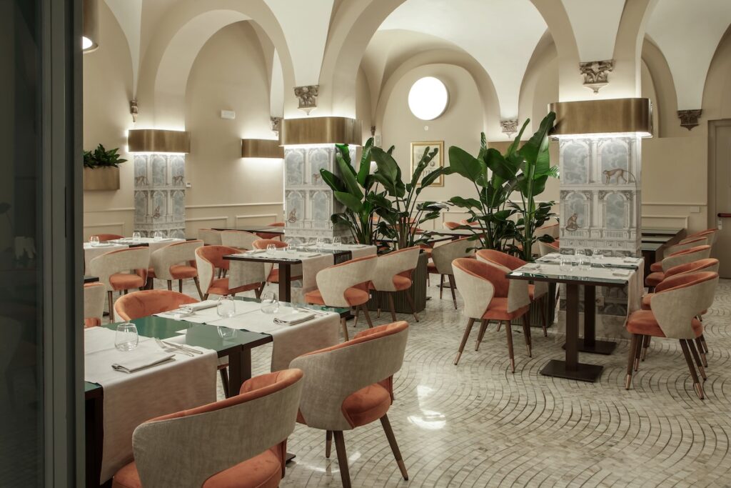 Accanto a questi ambienti, trovano spazio un sushi umbro che mette in dialogo tradizione gastronomica locale e cultura giapponese, e un jazz club nascosto dietro la reception, progettato come uno speakeasy in stile americano durante gli anni del proibizionismo. Un luogo da scoprire, che anima le serate perugine con concerti e cocktail d’autore. Il ristorante Casa Vannucci, invece, gioca su un’eleganza più classica: soffitti ad arco, luci calibrate, arredi su misura e carte da parati Fornasetti costruiscono un’atmosfera senza tempo.