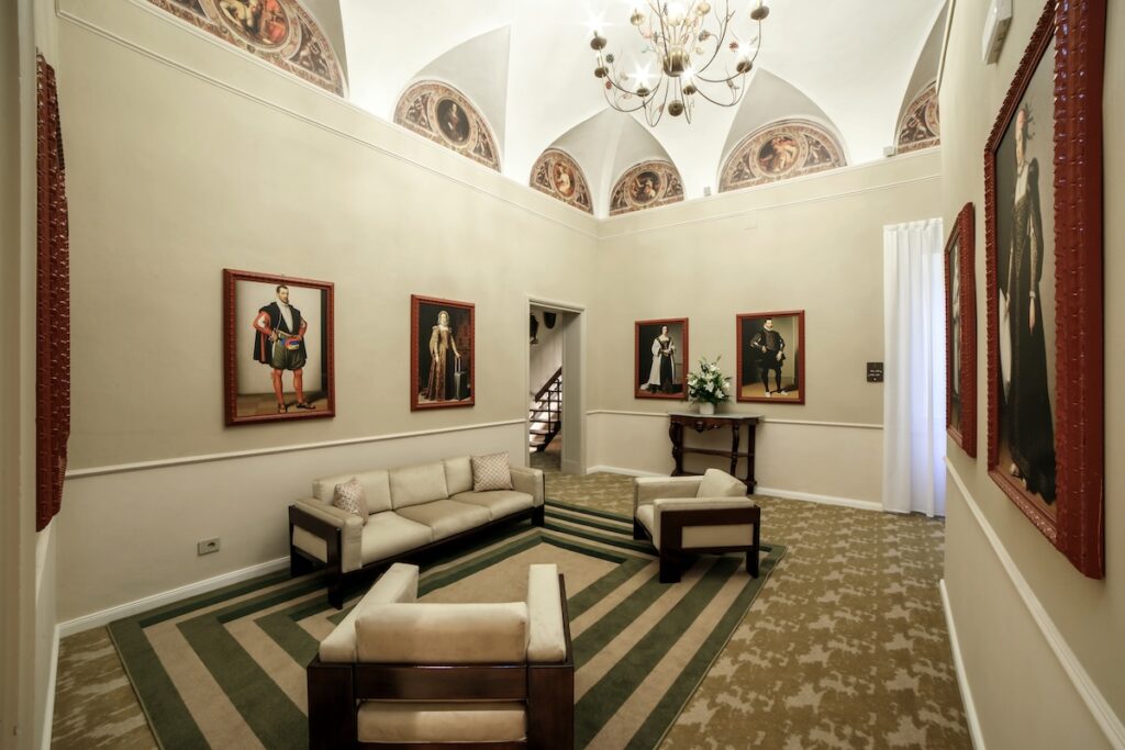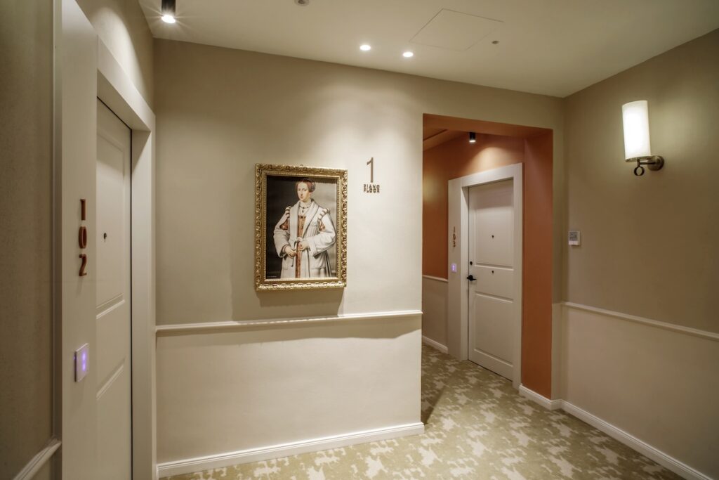 Gli spazi comuni sono concepiti come le stanze di una dimora storica, attraversate da colori e riferimenti all’arte locale. I dipinti rinascimentali, la monumentalità dell’architettura italiana e i pattern derivati dalla formella del Duomo di Perugia diventano matrice visiva per camere, spazi condivisi e identità grafica, sviluppata insieme allo studio Fattoria Creativa.
