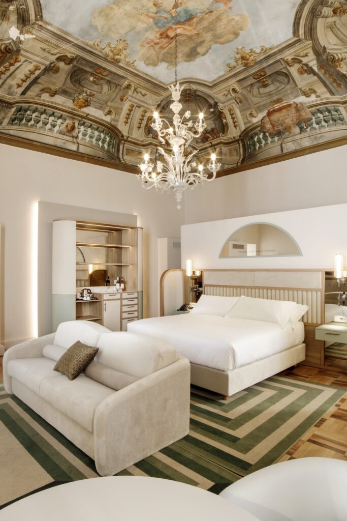 Le 70 camere declinano lo stesso equilibrio tra memoria e progetto. Tessuti, pattern e arredi disegnati su misura accompagnano l’ospite in un ambiente curato e riconoscibile. Un dettaglio simbolico introduce subito al luogo: una scatola in legno porta cioccolatini, presente in ogni stanza, che riproduce il disegno delle formelle del Duomo. Sulle testate dei letti compare la frase Heritage is the root of the future, sintesi efficace della filosofia dell’intervento.