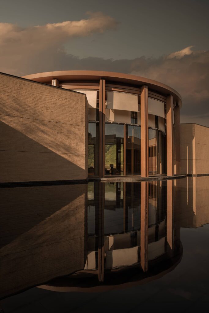 Il design si ispira alle iurta e agli insediamenti nomadi, catturando il ritmo lento delle identità culturali del luogo e delle tradizioni dei popoli della steppa. Con i suoi volumi distribuiti, l’hotel si confonde da lontano con le foreste che caratterizzano il paesaggio; in simbiosi con la natura, i vari elementi che lo compongono sono collegati tra loro da sentieri dall’andamento fluido.
