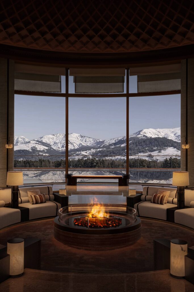 Il riferimento con il territorio e la vita nomade della steppa è sempre percepito in ogni ambiente, fin dalla reception che ricorda, con le sue sedute intorno a un camino centrale e la tettoia soprastante, scene di vita nella steppa come i raduni intorno al fuoco delle popolazioni nomadi. Ampie vetrate curve a tutta altezza chiudono la lounge mettendola in collegamento visivo con l’esterno; qui l’indoor si confonde con l’outdoor, garantendo la piena vista sulle montagne del Thiansan.